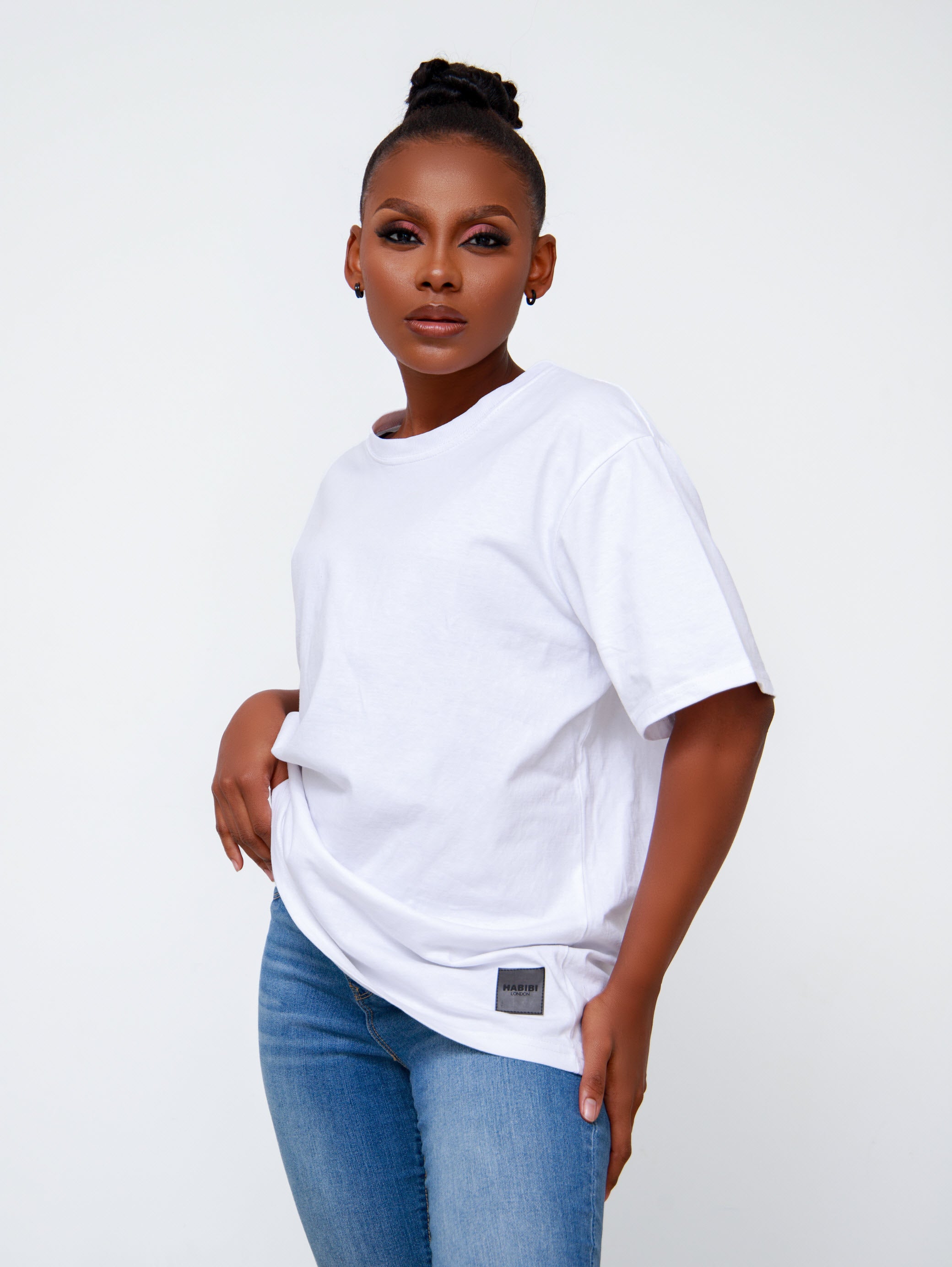 Introducing the Women's Habibi London Classic T-shirt in a timeless White. With a clean, minimalist design and a Sythetic leather-look badge, this piece is a wardrobe staple. Made from 100% organic cotton for ultimate comfort.