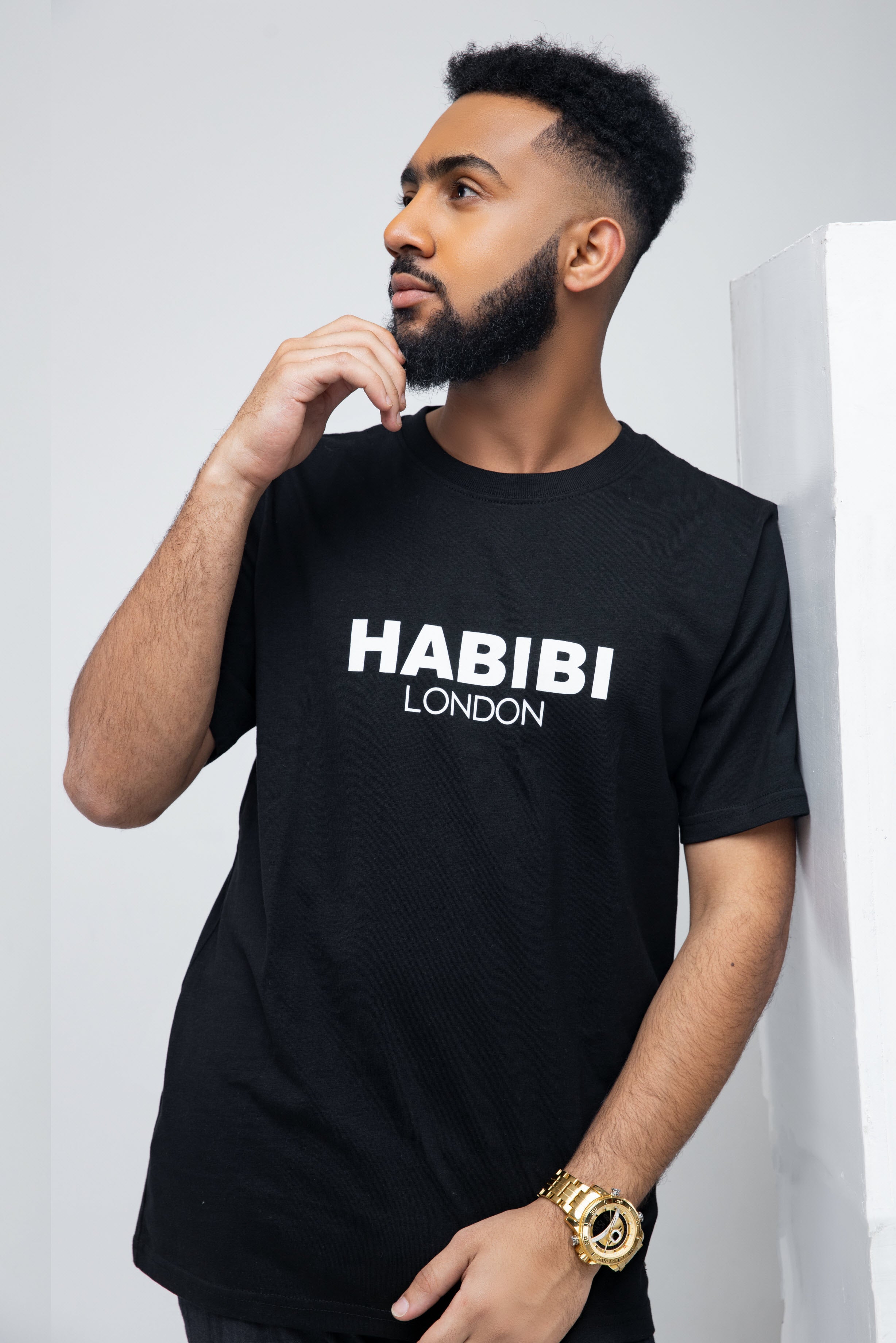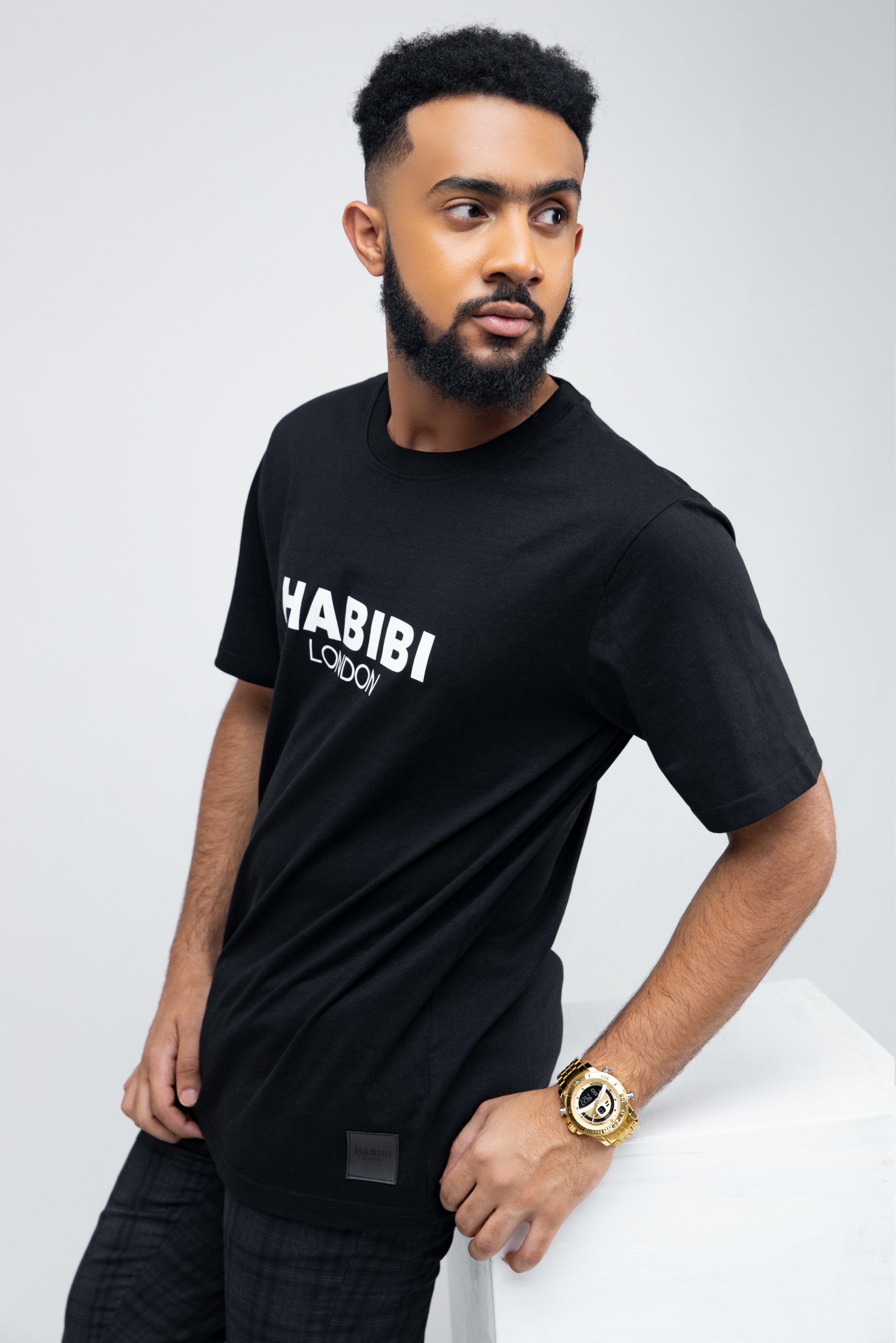 Introducing the Men's Black Short Sleeve Habibi London Classic Logo T-shirt. A bold and sophisticated piece, this tee features a striking Habibi London logo on the chest and a Synthetic leather-look badge for a touch of luxury. Crafted from 100% organic cotton, it's both comfortable and stylish, exuding an air of mystery and confidence.