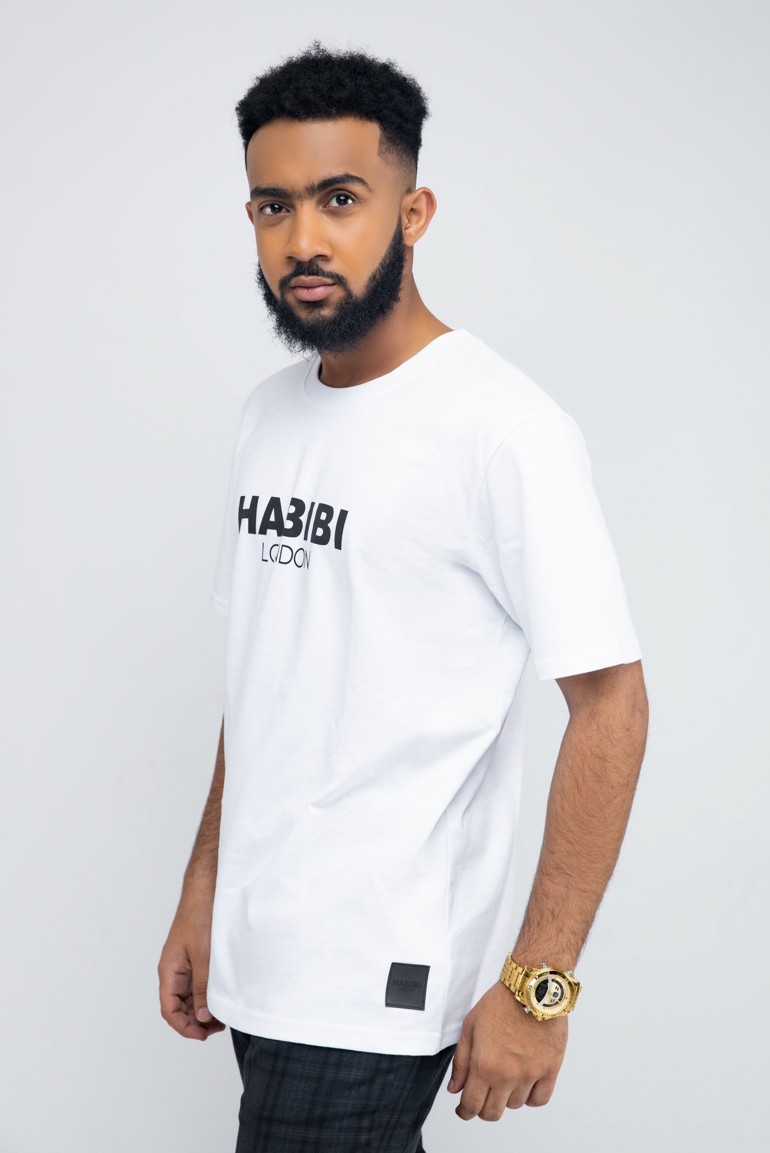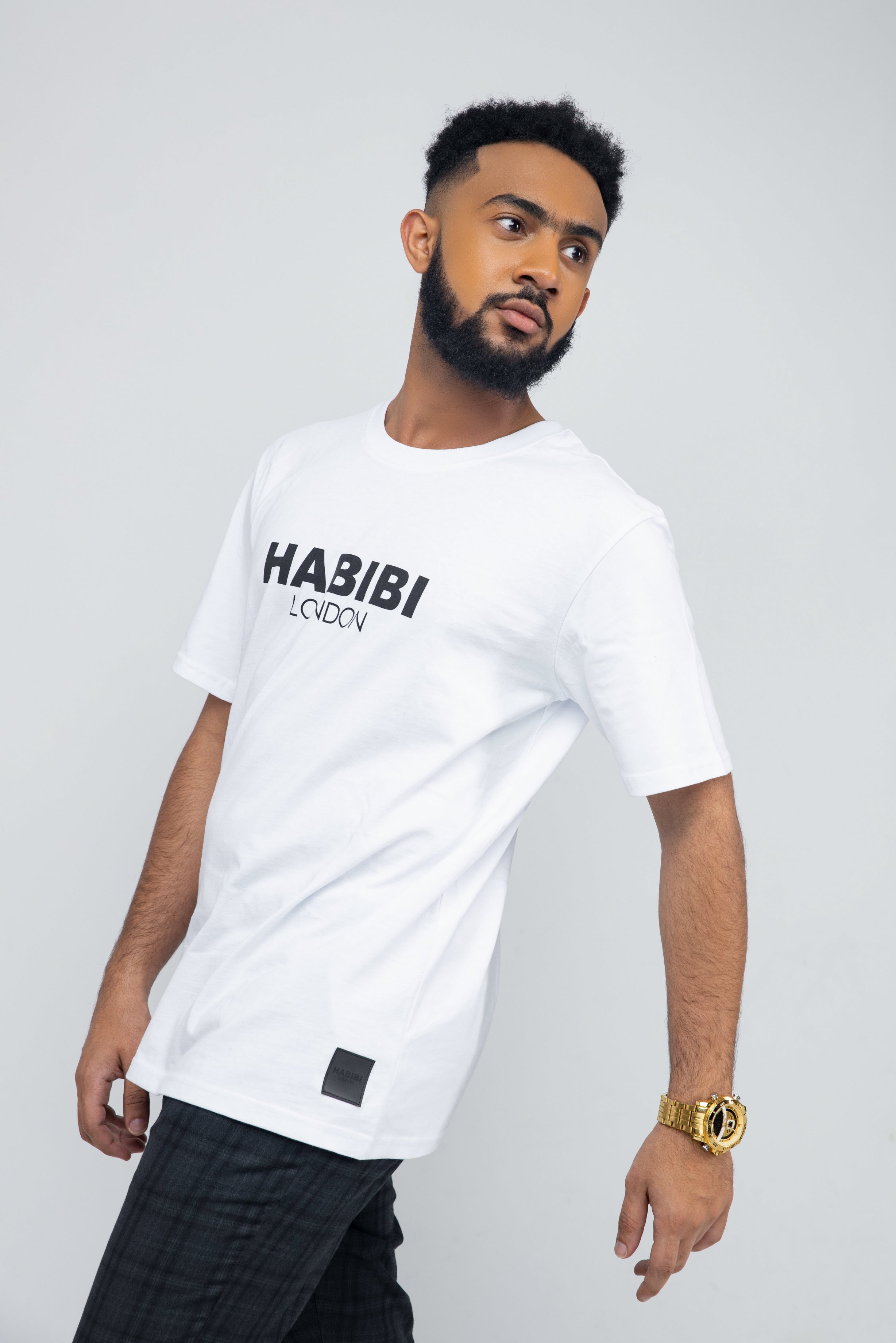 Elevate your wardrobe with the Men's White Habibi London Classic Logo T-shirt. This timeless piece features a bold logo and a Synthetic leather-look badge, adding a touch of sophistication to any outfit. Crafted from soft, breathable fabric, it's both comfortable and stylish.